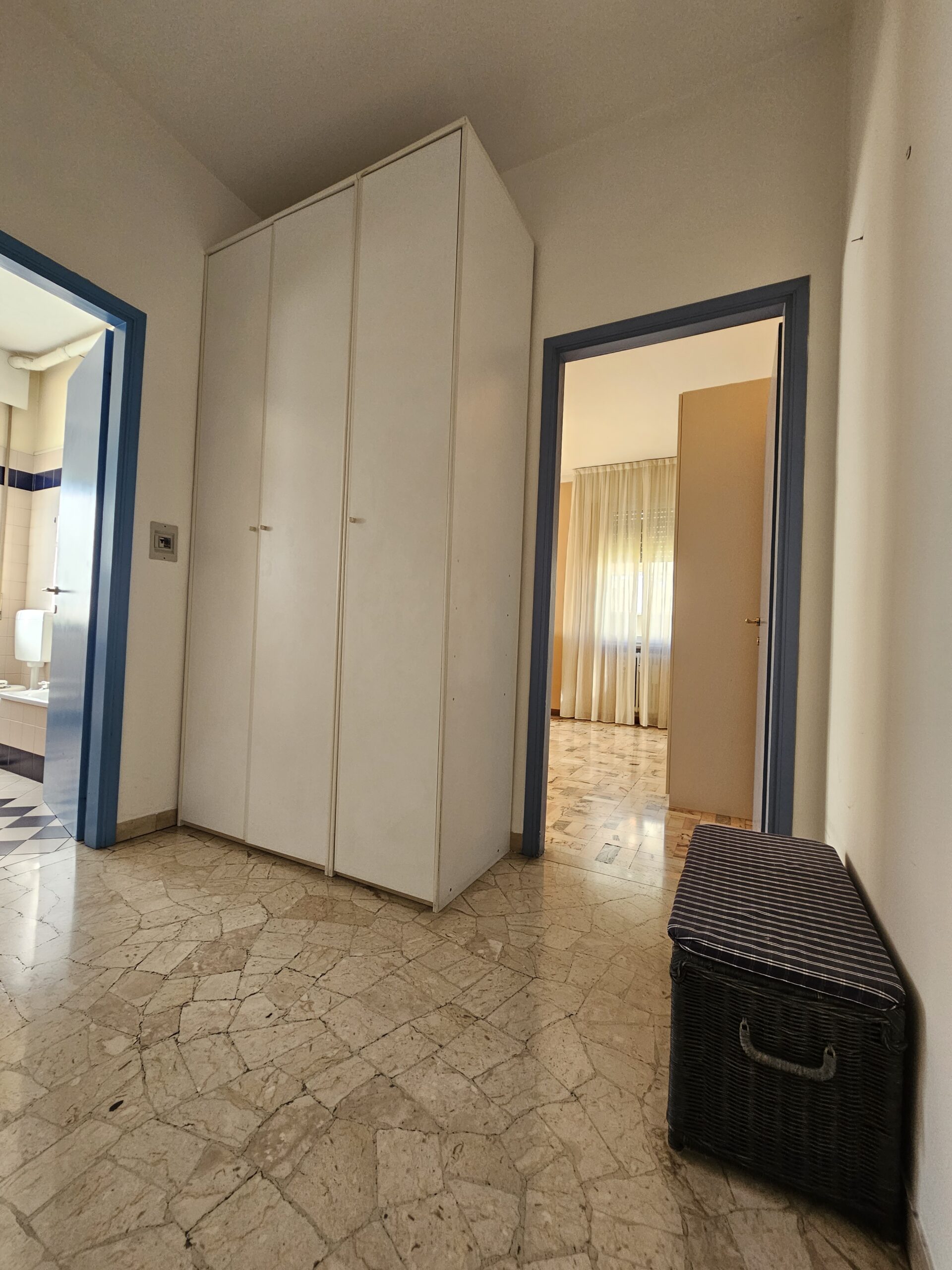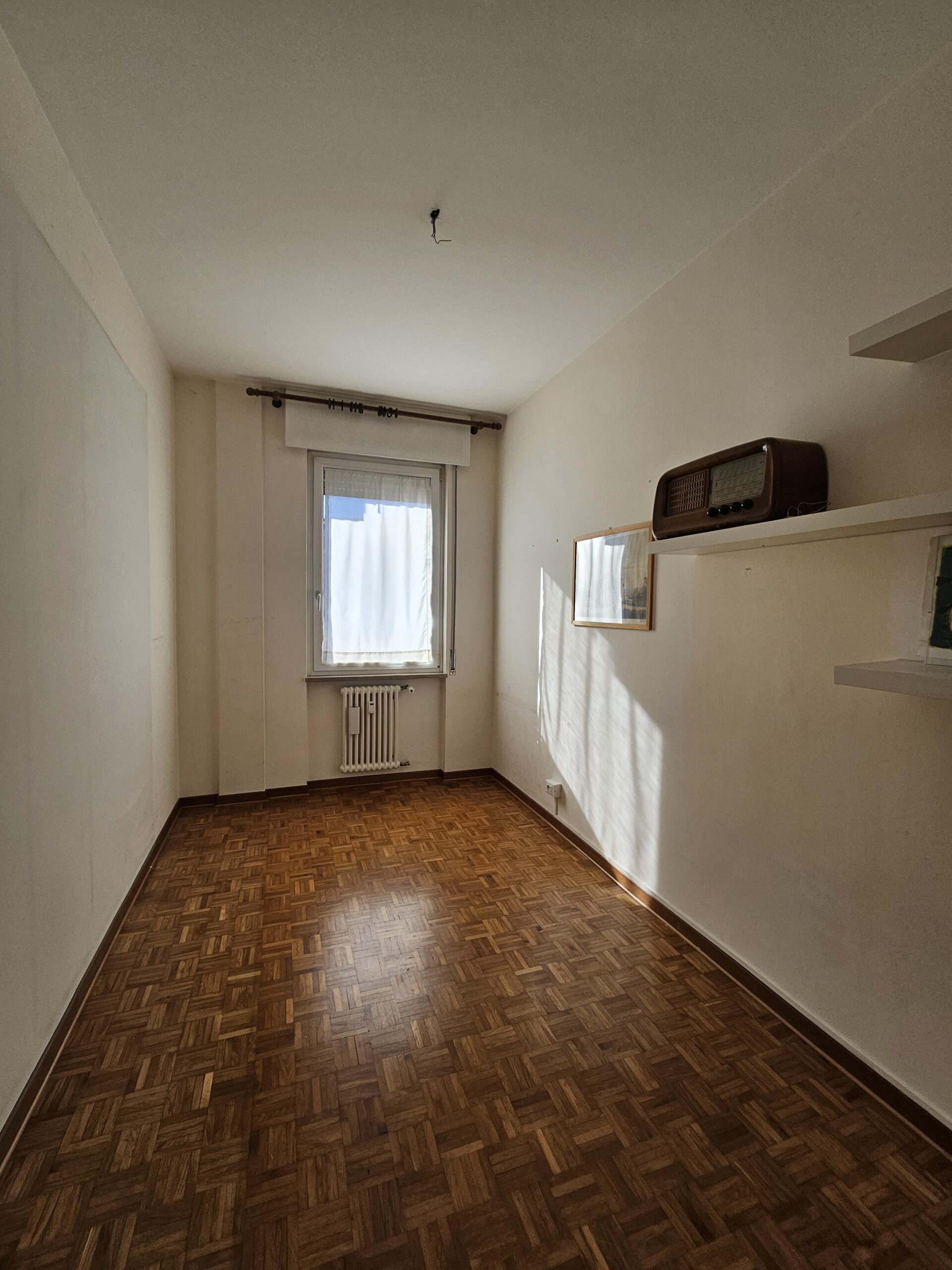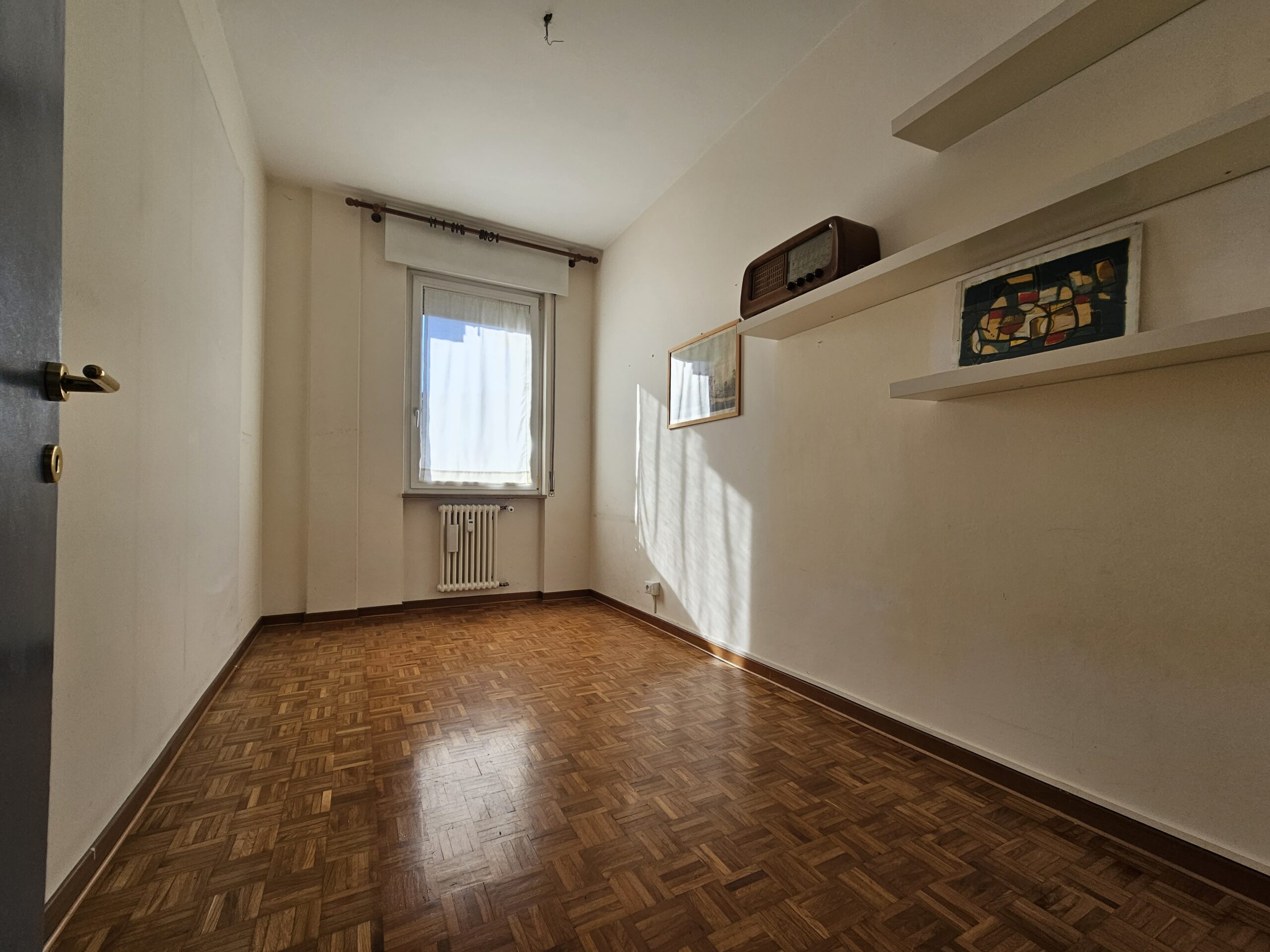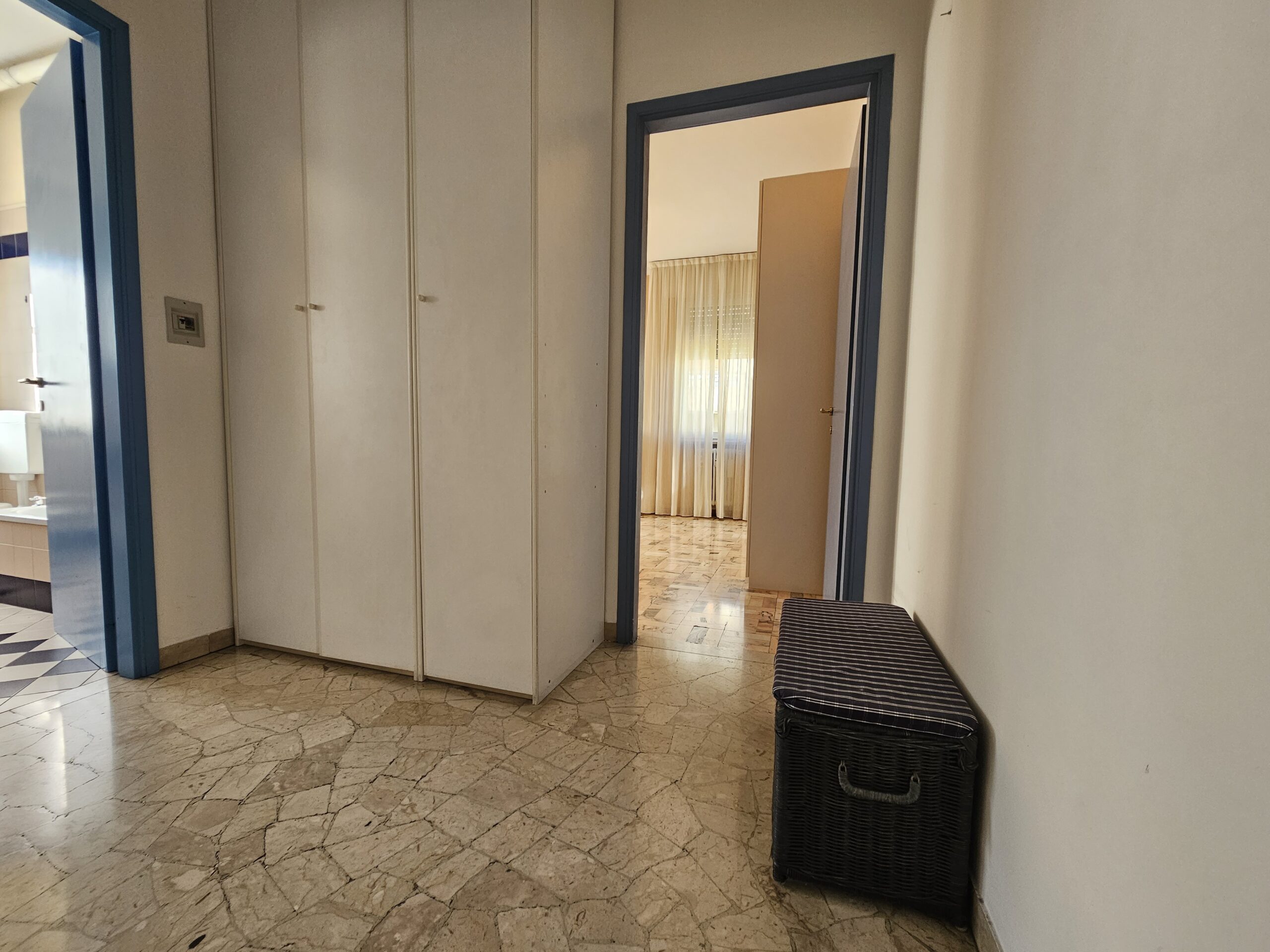 L’appartamento dispone di un corridoio notte che conduce a una camera matrimoniale con terrazzo privato e a una spaziosa camera singola. Il bagno finestrato garantisce luminosità e ventilazione. Inoltre, il garage al piano terra e la cantina offrono un ampio spazio extra.