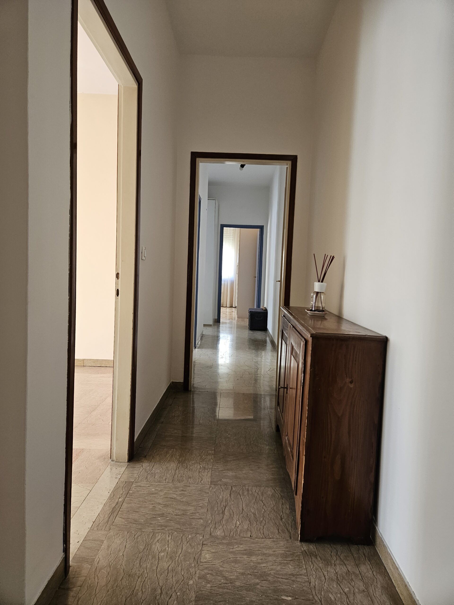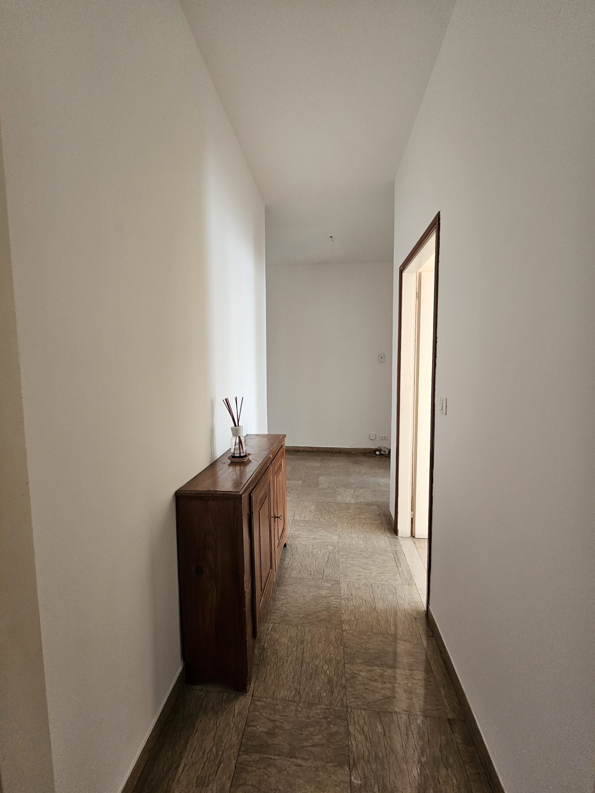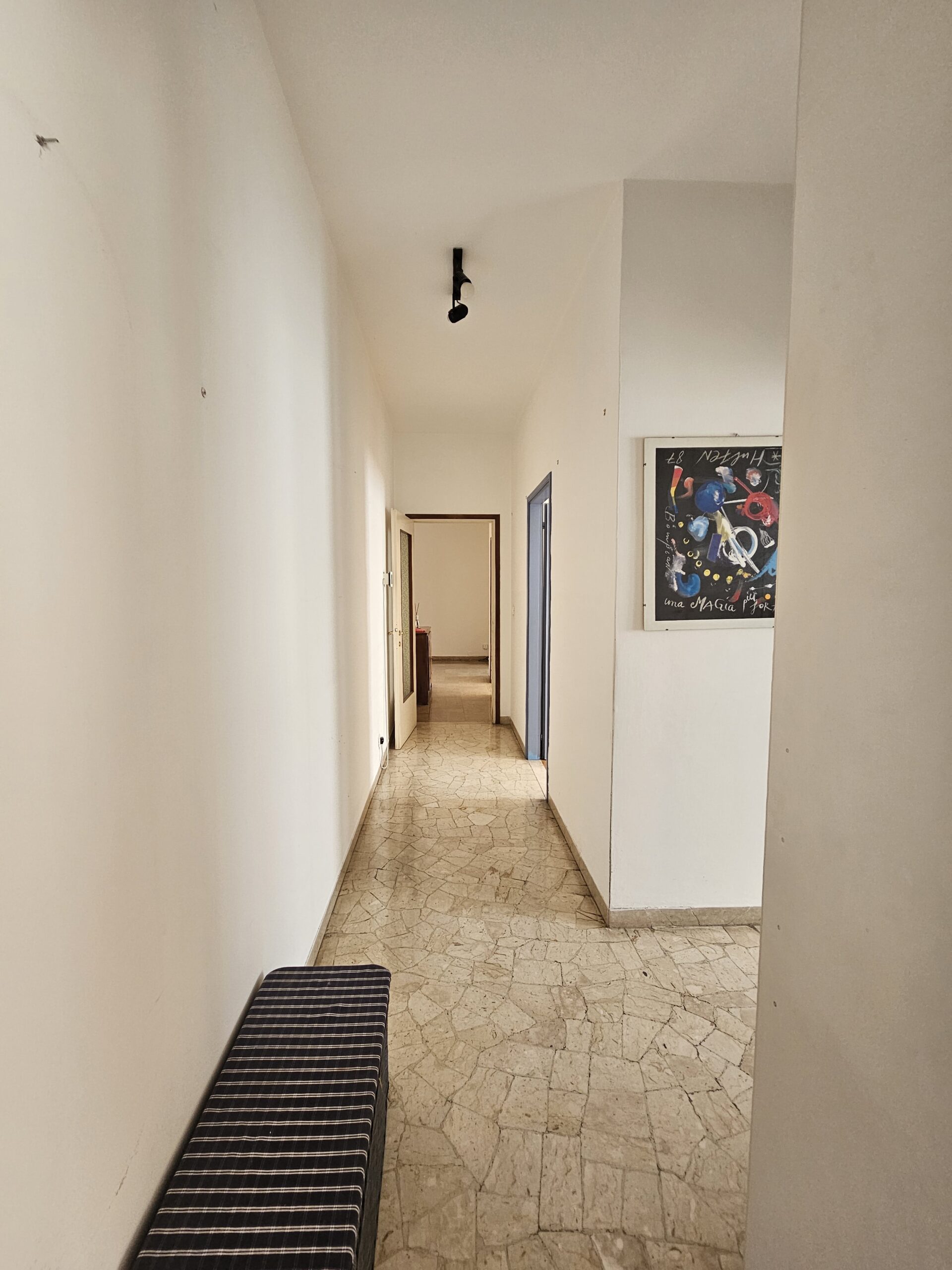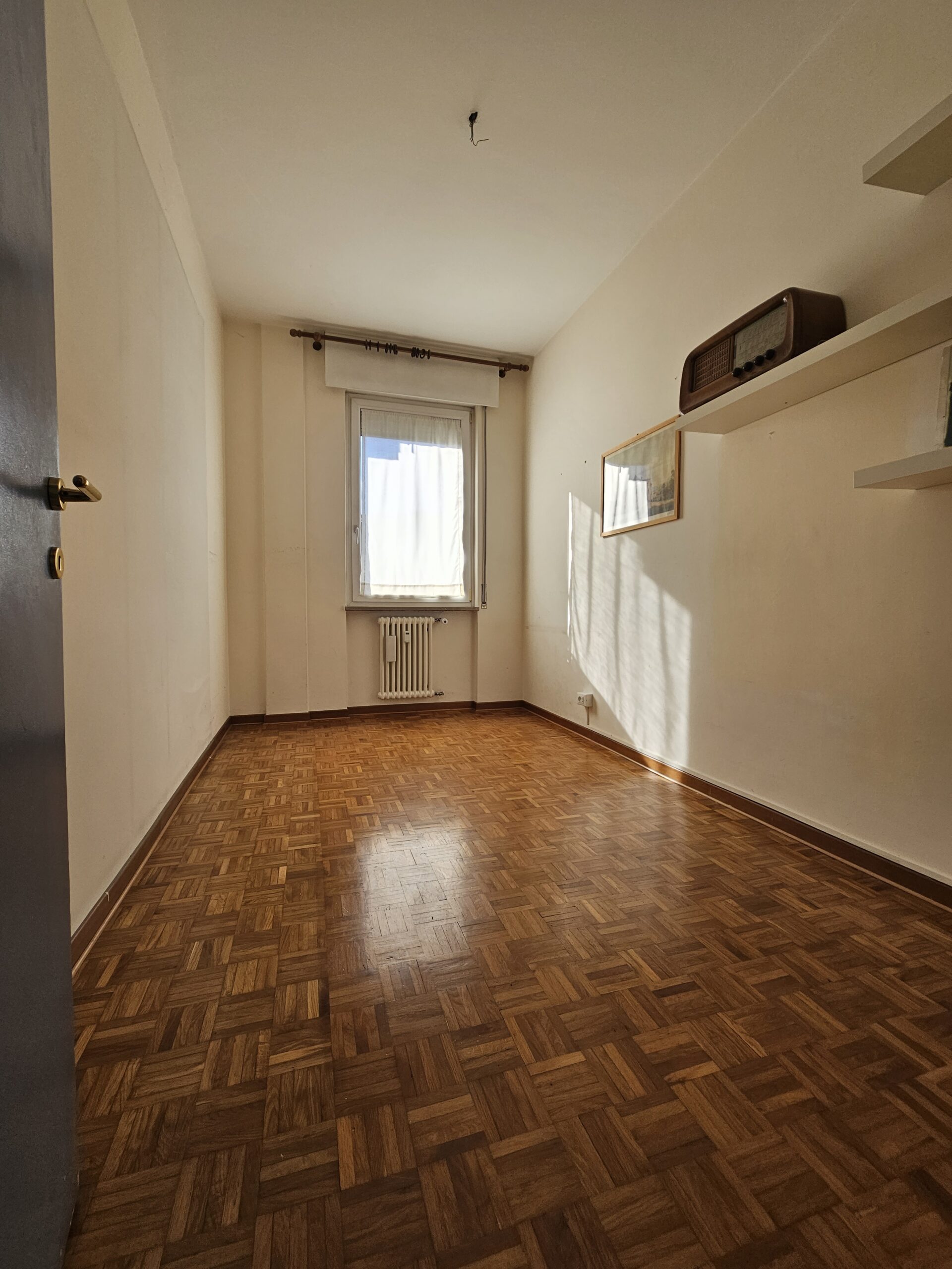 L’appartamento dispone di un corridoio notte che conduce a una camera matrimoniale con terrazzo privato e a una spaziosa camera singola. Il bagno finestrato garantisce luminosità e ventilazione. Inoltre, il garage al piano terra e la cantina offrono un ampio spazio extra.