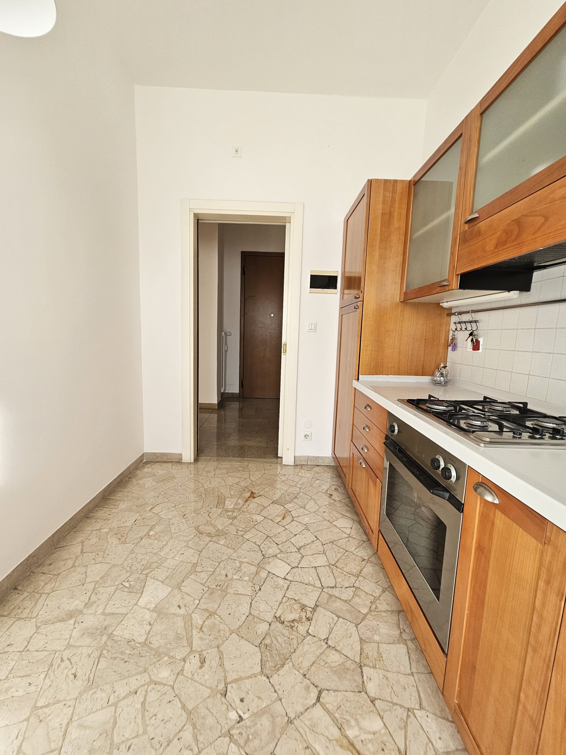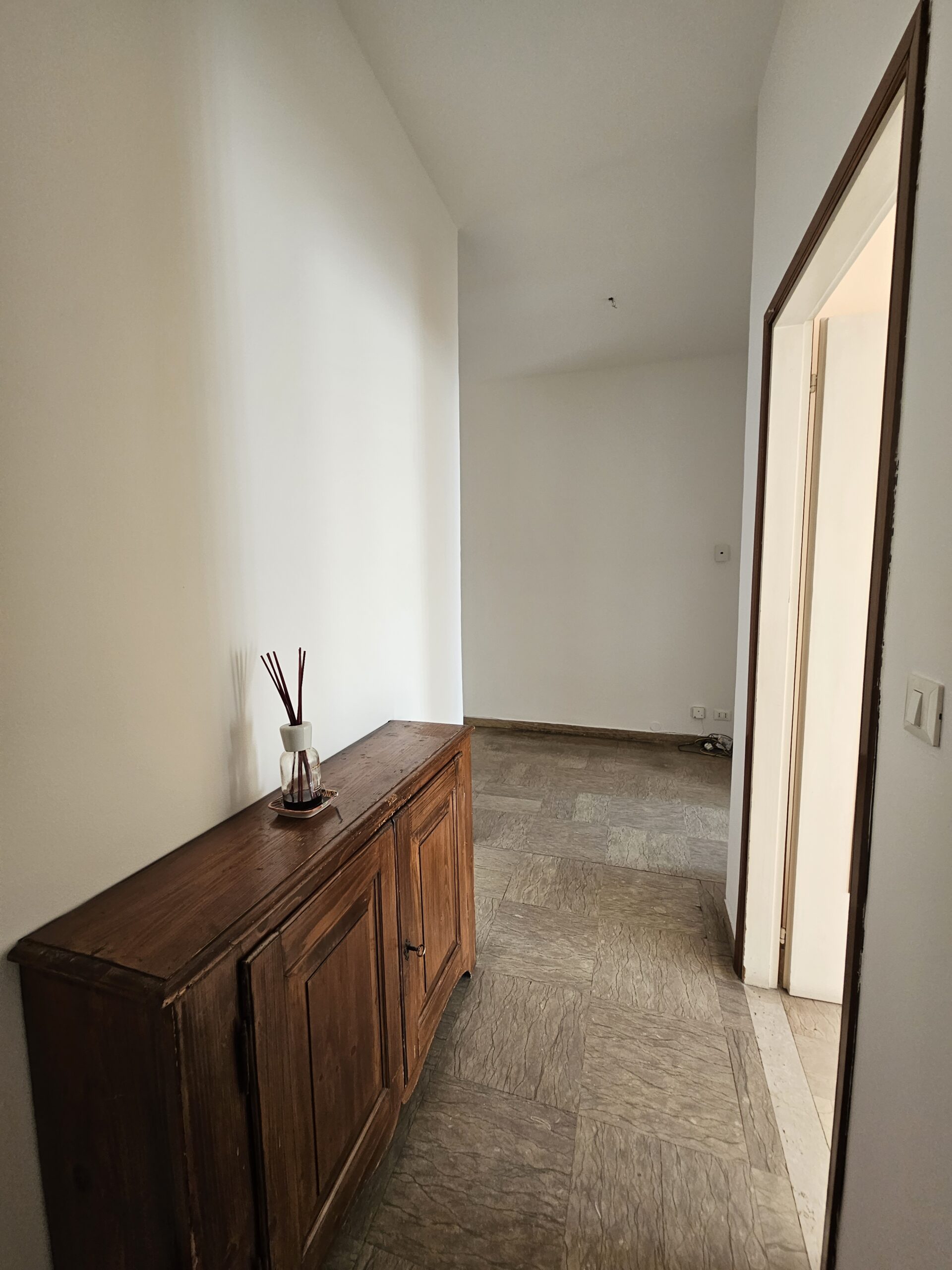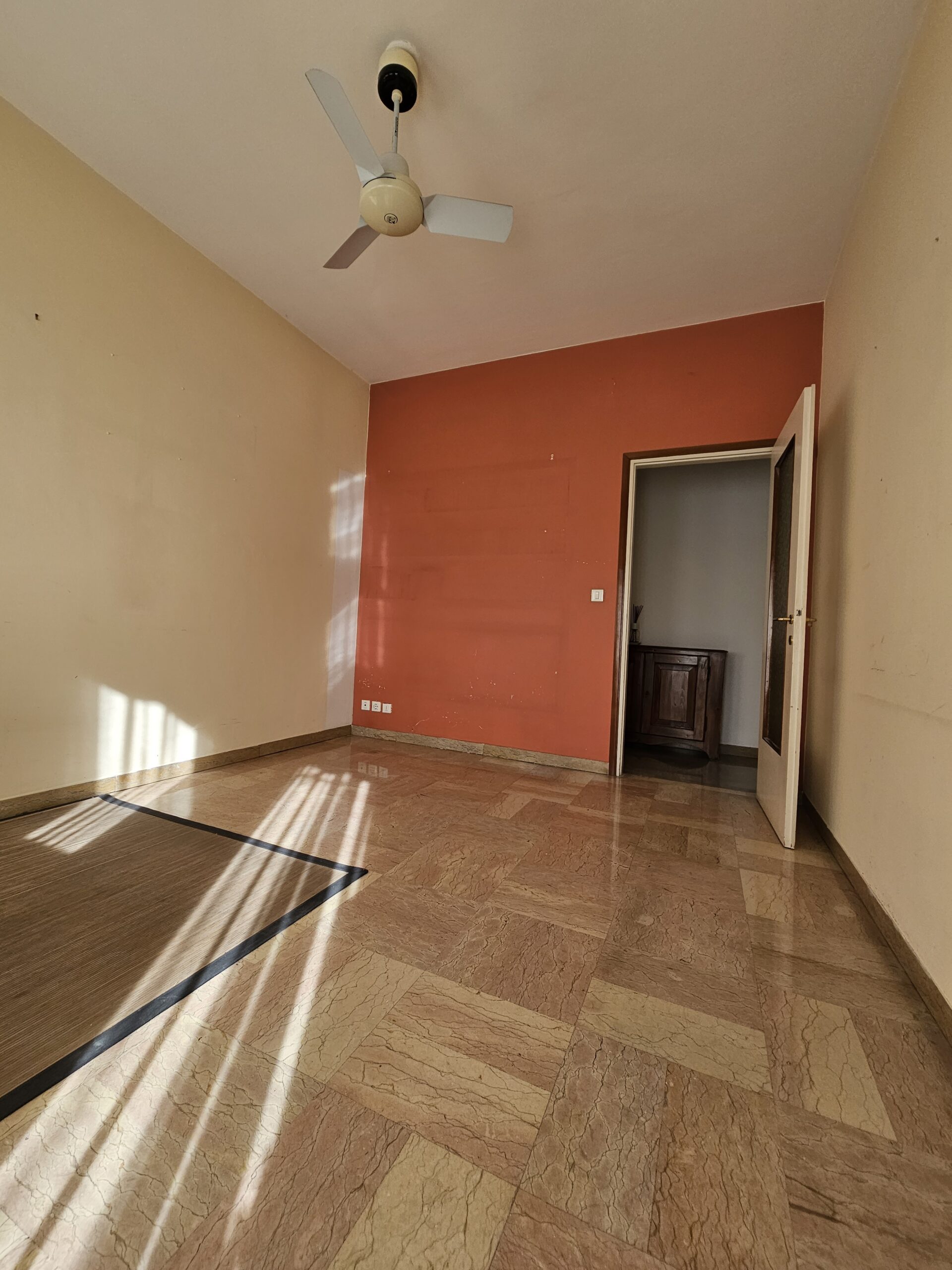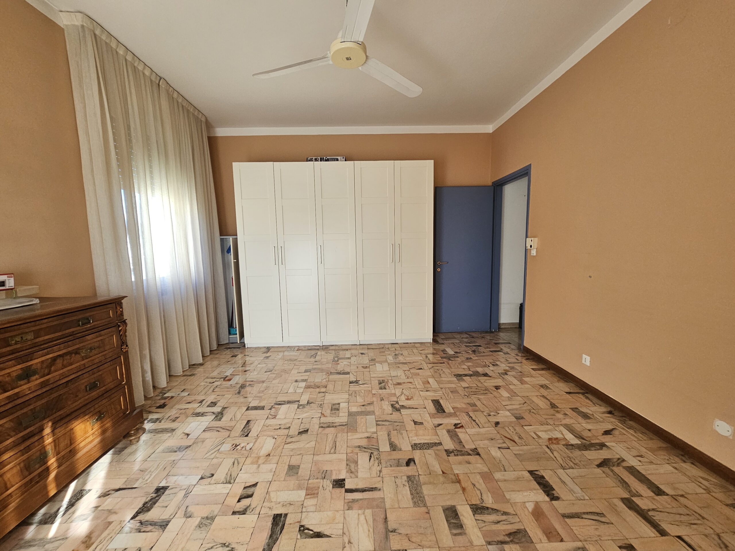 L’appartamento dispone di un corridoio notte che conduce a una camera matrimoniale con terrazzo privato e a una spaziosa camera singola. Il bagno finestrato garantisce luminosità e ventilazione. Inoltre, il garage al piano terra e la cantina offrono un ampio spazio extra.